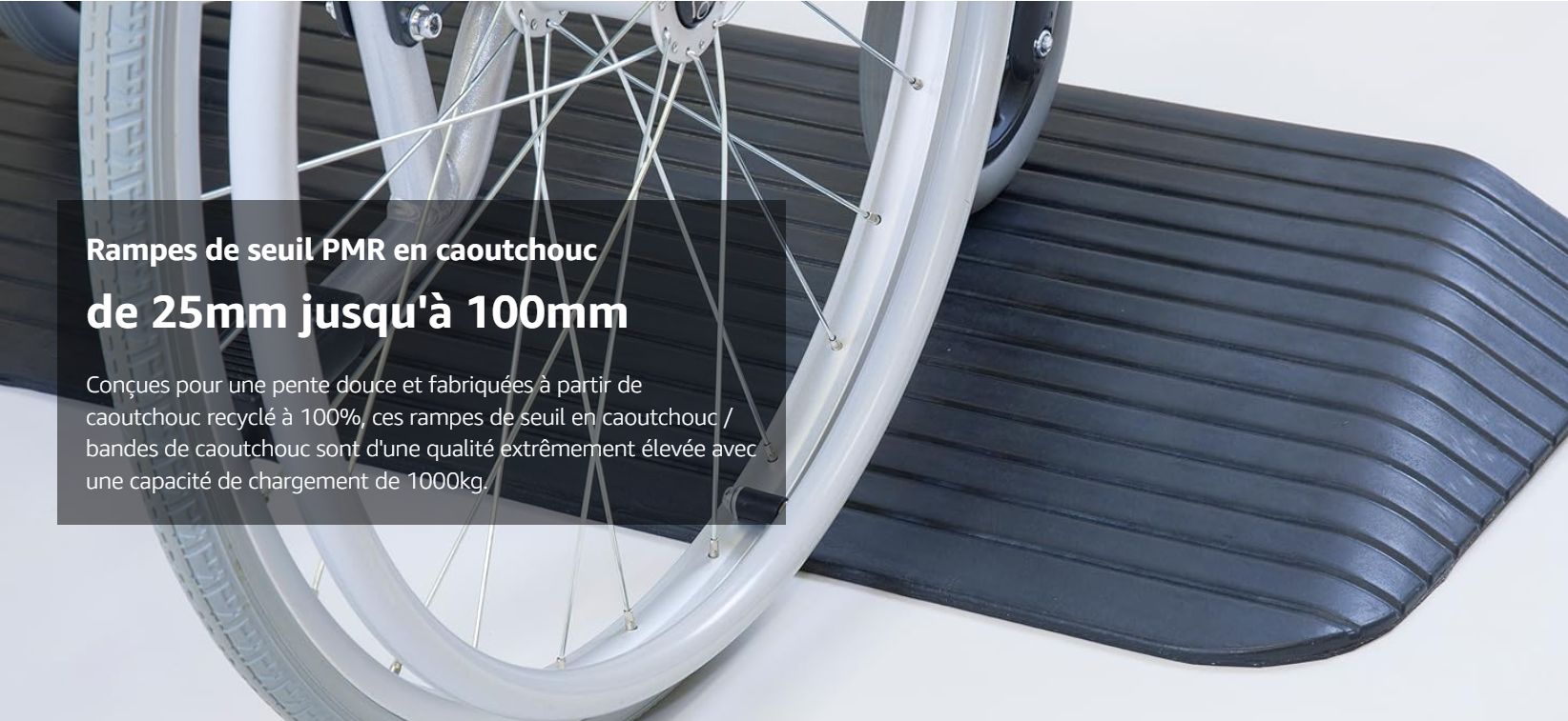permet le passage de seuil en fauteuil roulant jusqu'à 10 cm de hauteur d'obstacle à franchir, caoutchouc recyclé, supporte un poids maxi de 1 000 kg