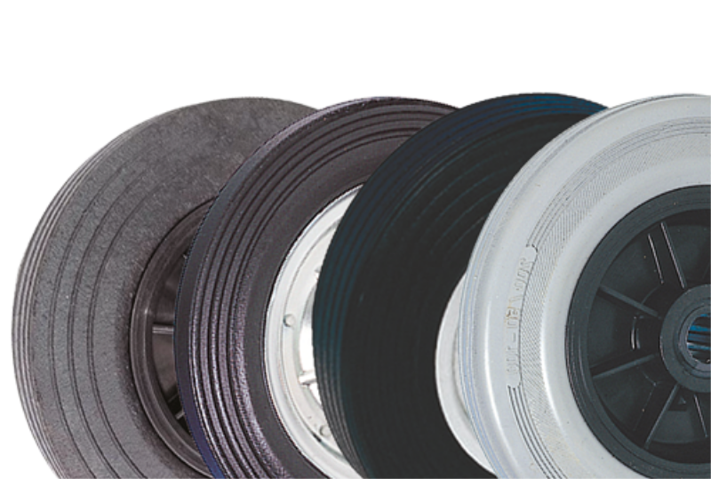 Il existe 2 types de roues en caoutchouc. Les roues en caoutchouc à bandage dites à « pneu pleins » que l’on retrouve également sur les fauteuils roulants.